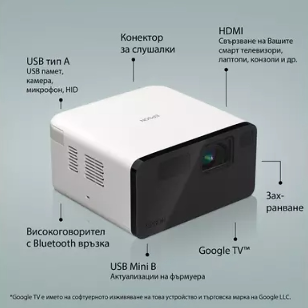 Други: Google TV, Automatic keystone correction, Built-in speaker, Chromecast, Google search, Horizontal and vertical keystone correction, Instant on/off, Quick Corner; 2D Colour Modes: Dynamic, Natural, Cinema, Vivid