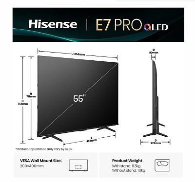 Телевизор Hisense 55" E7Q Pro, 4K Ultra HD 3840x2160, QLED, Quantum Dot, 144Hz, HDR 10+ adaptive, HLG, Dolby Vision, DTS Virtual X, Smart TV, WiFi 5GHz, WiFi Direct, BT, Anyview Cast, 3xHDMI, 2xUSB, LAN, CI+, DVB-T2/C/S2, Black
