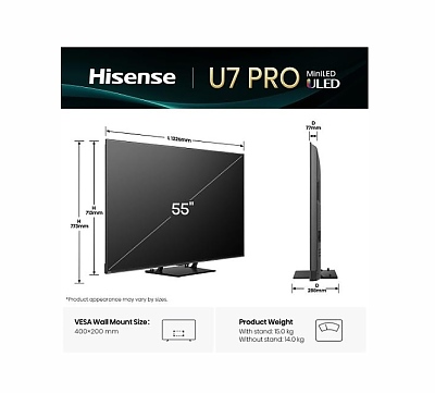 Телевизор Hisense 55"U7Q Pro, 4K Ultra HD 3840x2160, ULED, FALD, Quantum Dot, 165Hz, IPS, HDR 10+, HLG, Dolby Vision IQ, Dolby Atmos, Smart TV, WiFi 5GHz, WiFi Direct, BT, Anyview Cast,light sensor,Solar Powered Remote, 4xHDMI, 2xUSB, LAN, CI+, D