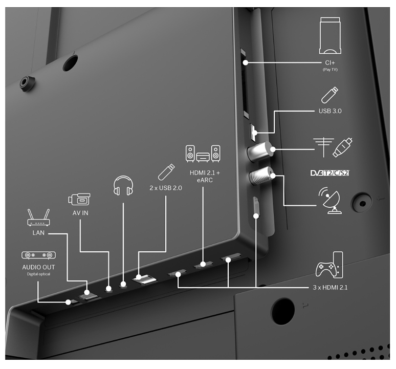 Изводи за свързване: 4 HDMI, 3 USB, CI+ slot, SPDIF optical
