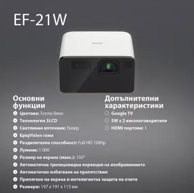 Други: Google TV, Automatic keystone correction, Built-in speaker, Chromecast, Google search, Horizontal and vertical keystone correction, Instant on/off, Quick Corner; 2D Colour Modes: Dynamic, Natural, Cinema, Vivid