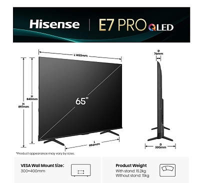 Телевизор Hisense 65" E7Q Pro, 4K Ultra HD 3840x2160, QLED, Quantum Dot, 144Hz, HDR 10+ adaptive, HLG, Dolby Vision, DTS Virtual X, Smart TV, WiFi 5GHz, WiFi Direct, BT, Anyview Cast, 4xHDMI, 2xUSB, LAN, CI+, DVB-T2/C/S2, Black