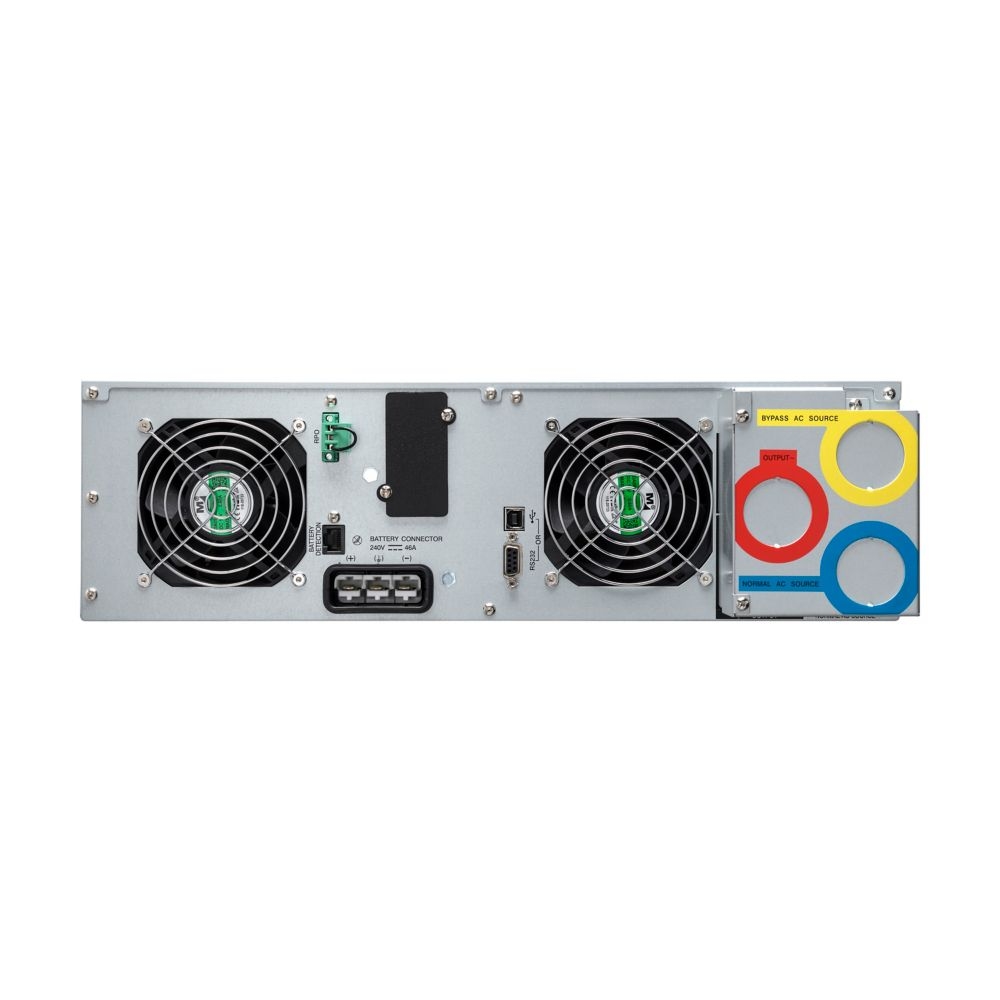 | Тип изводи | Terminal block; Input: Terminal block (63A); Communication: USB port (HID compliant), Serial port (RS232), Mini-terminal block for remote power off, One slot for optional communication card |